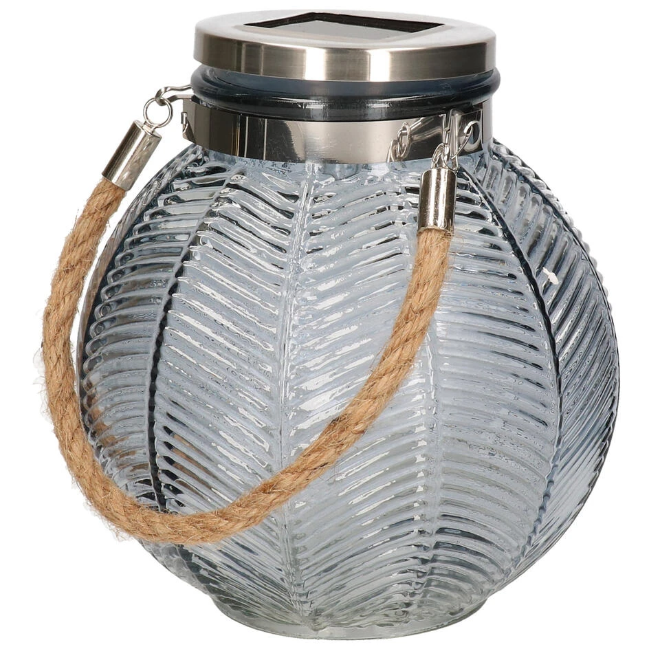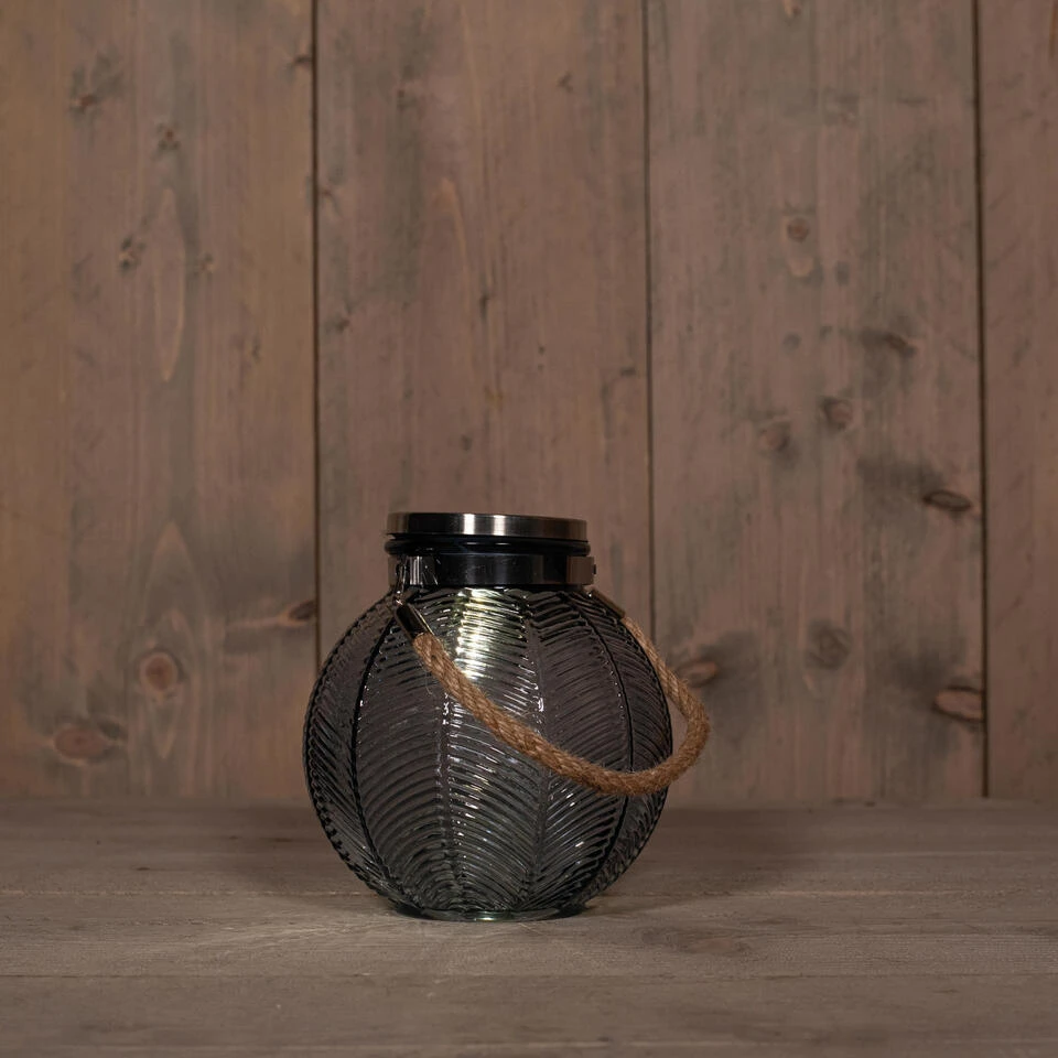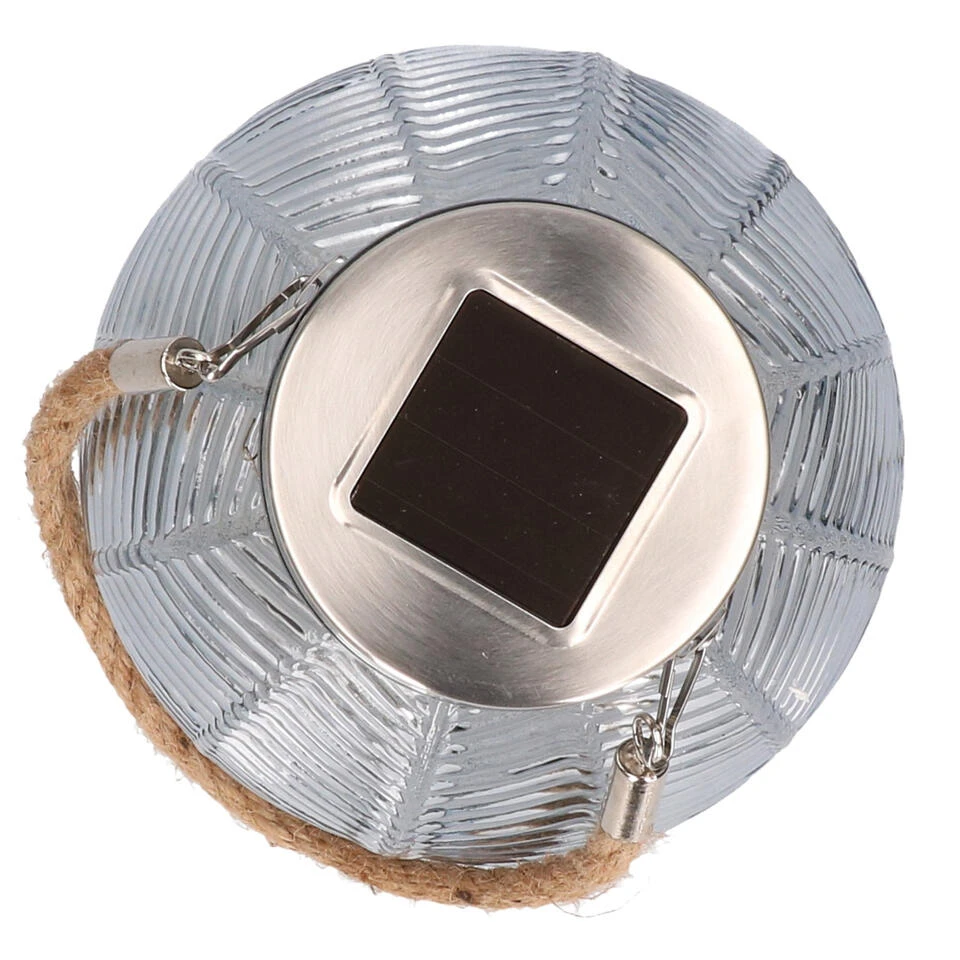 Grijze solar lantaarn van glas rond. De verlichting werkt op zonne-energie waardoor het zichzelf oplaadt gedurende de dag. U kunt de lantaarn neerzetten of ophangen aan het handvat van touw voor een gezellige sfeer in de tuin, bijvoorbeeld op tafel of aan houders voor hangplanten. Formaat: 16 x 14,5 cm. Kleur licht: warm wit. Kleur lamp: grijs. Materiaal: gestreept glas.
