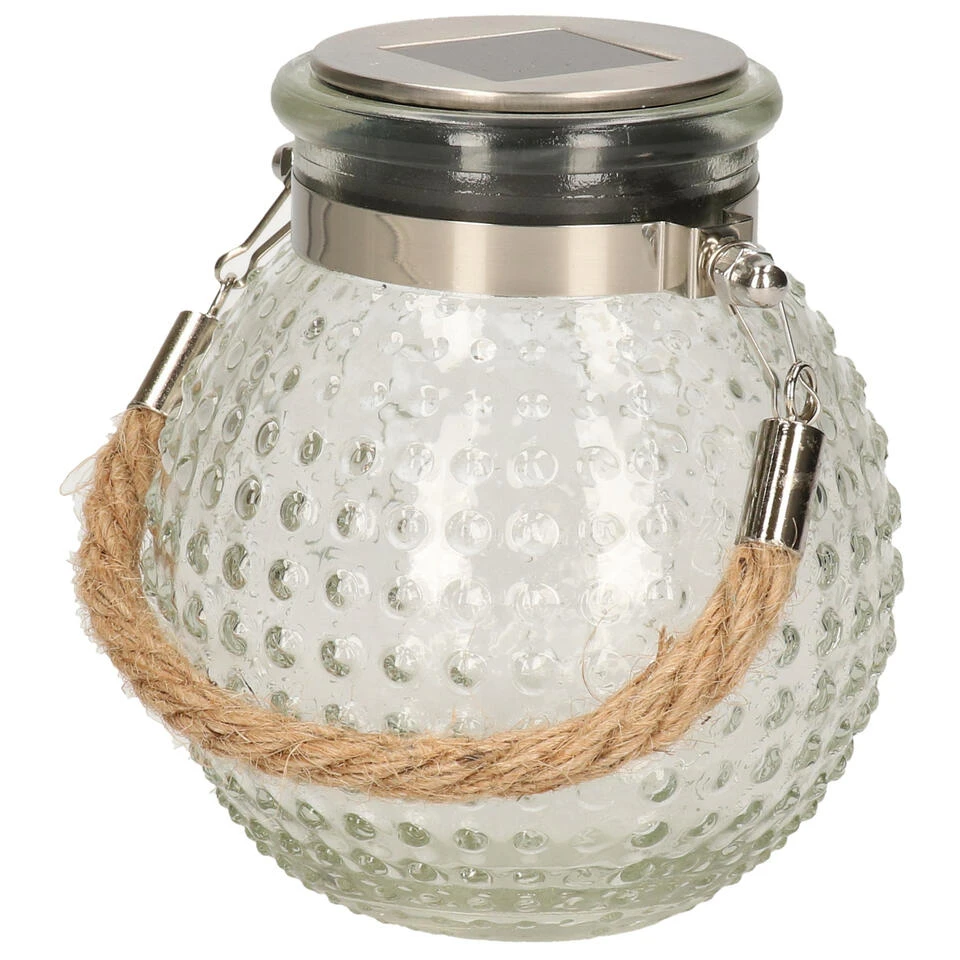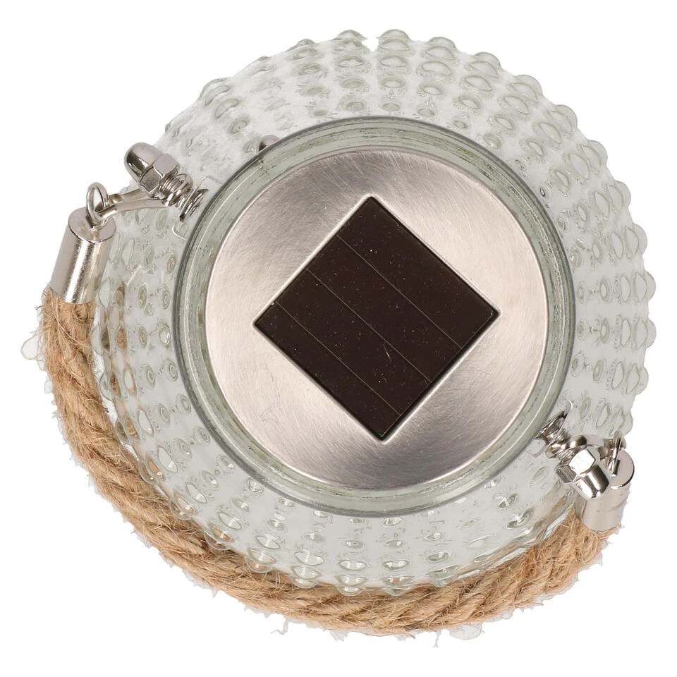 Anna’s Collection transparante solar lantaarn van glas rond. De verlichting werkt op zonne-energie waardoor het zichzelf oplaadt gedurende de dag. U kunt de lantaarn neerzetten of ophangen aan het handvat van touw voor een gezellige sfeer in de tuin, bijvoorbeeld op tafel of aan houders voor hangplanten. Formaat: 10 x 12 cm. Kleur licht: warm wit. Kleur lamp: transparant. Materiaal: bubbel patroon glas.