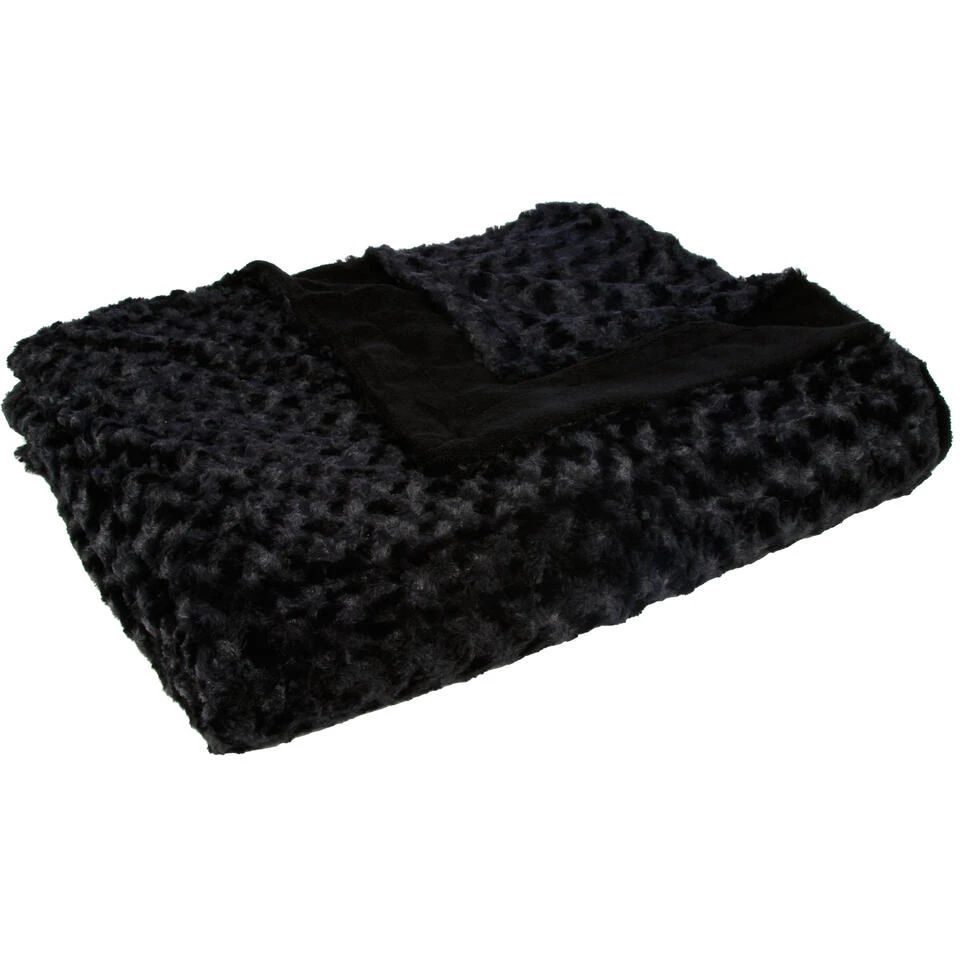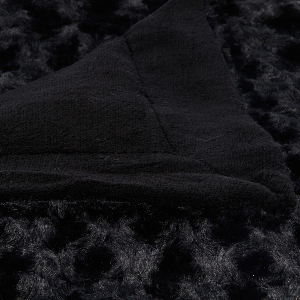 Bank/bed sprei/deken/plaid geknoopt motief 230 x 180 x 2 cm zwart. Een rechthoekige zachte en warme deken voor op de bank of als extra dekentje op bed, in een mooi genoopte stof stijl. De onderkant van de deken is zacht polyester, de bovenzijde geknoopt. Wasvoorschrift: wasmachine/droger bestendig, niet strijken.