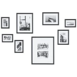 Fotocollage set van 8 met zwarte MDF kaders. Deze set ingelijste foto’s is een perfect decoratie-idee voor elk interieur. De minimalistische zwart-witbeelden met landschappen en stedelijke taferelen zijn zeer smaakvol en elegant, terwijl de dunne MDF-frames de aandacht niet afleiden van hun inhoud. Je kunt de wanddecoraties vrij rangschikken met behulp van de haken voor eenvoudige bevestiging, of zelfs je eigen foto’s in de kaders plaatsen.