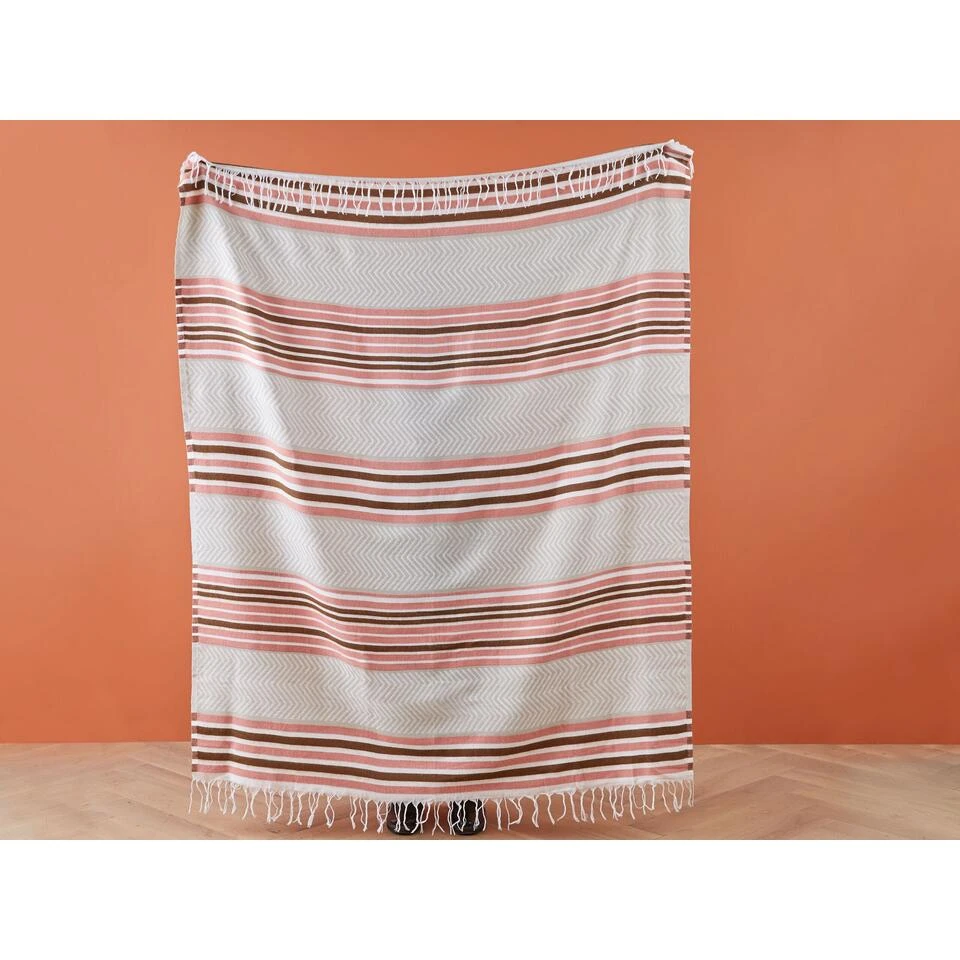 Rechthoekig deken met franjes en gestreept patroon. Maak van je woonkamer een echte blikvanger met dit stijlvolle rechthoekige deken. Gemaakt van warm en zacht polyester en acryl. Het deken heeft een strepen patroon in verschillende kleurtinten met een beige chevron patroon tussendoor. Een opvallend stuk voor in elk modern interieur.