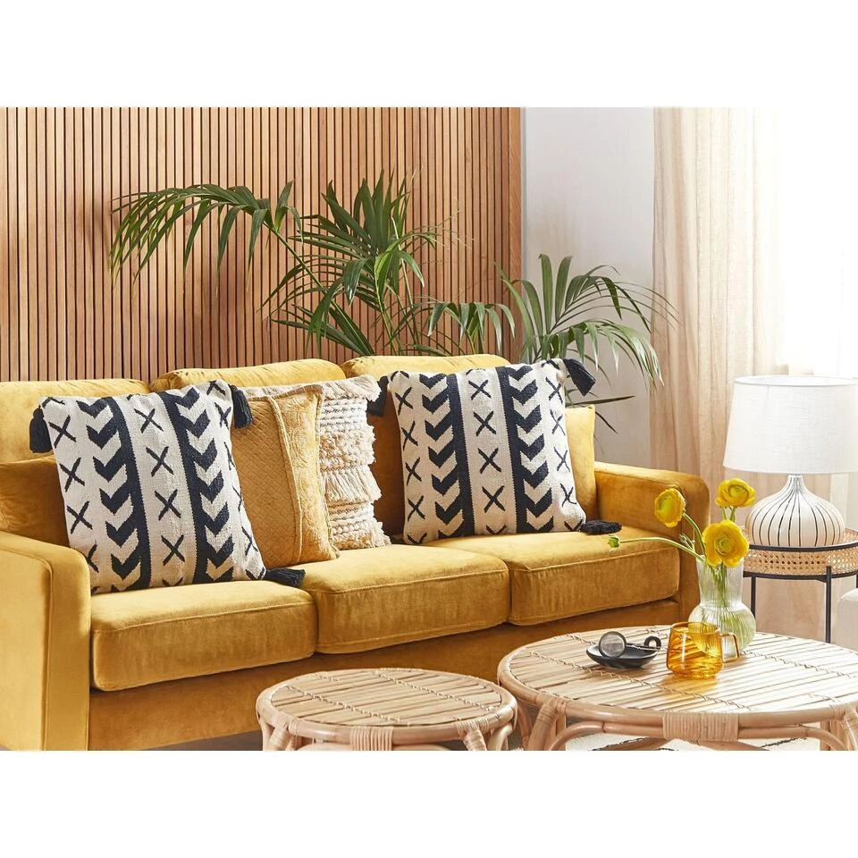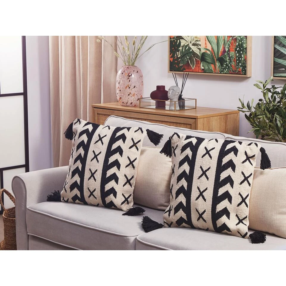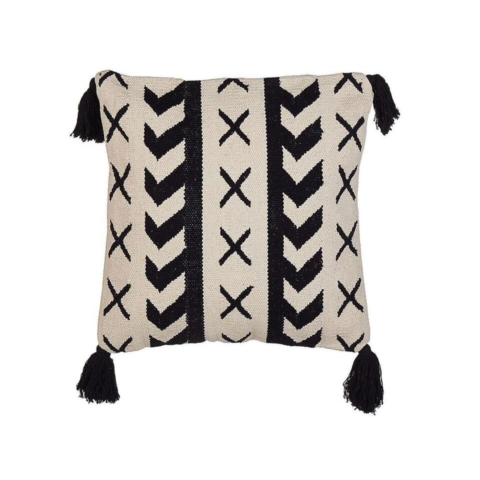 Handgeweven Decoratief Sierkussen in Boho Stijl. Als je wilt dat je interieur er gezellig uitziet, versier het dan met dit handgemaakte kussen. De prachtige katoenen hoes, met kwastjeshoeken en zwart geometrisch patroon, geeft een boho touch aan elke woon- of slaapkamer. De kussenhoes is afneembaar voor eenvoudige reiniging en wordt geleverd met een hoogwaardige polyester vulling.