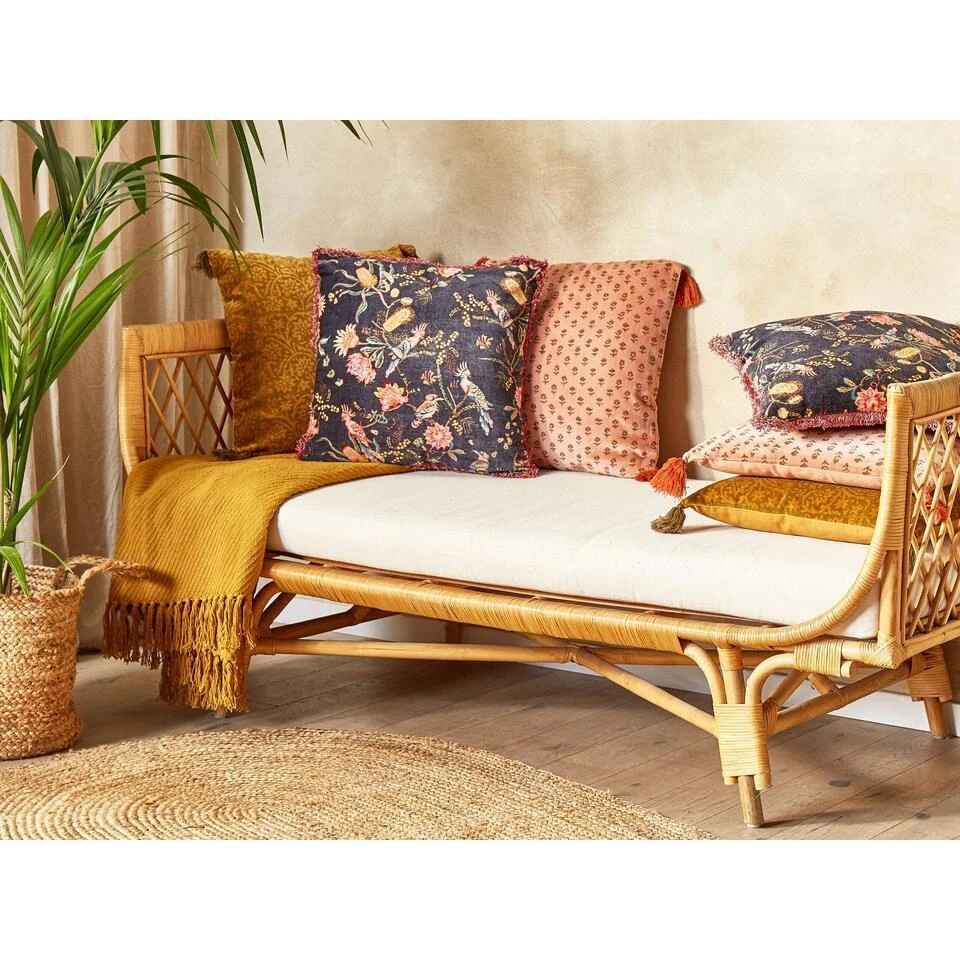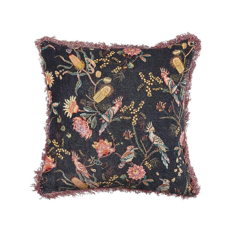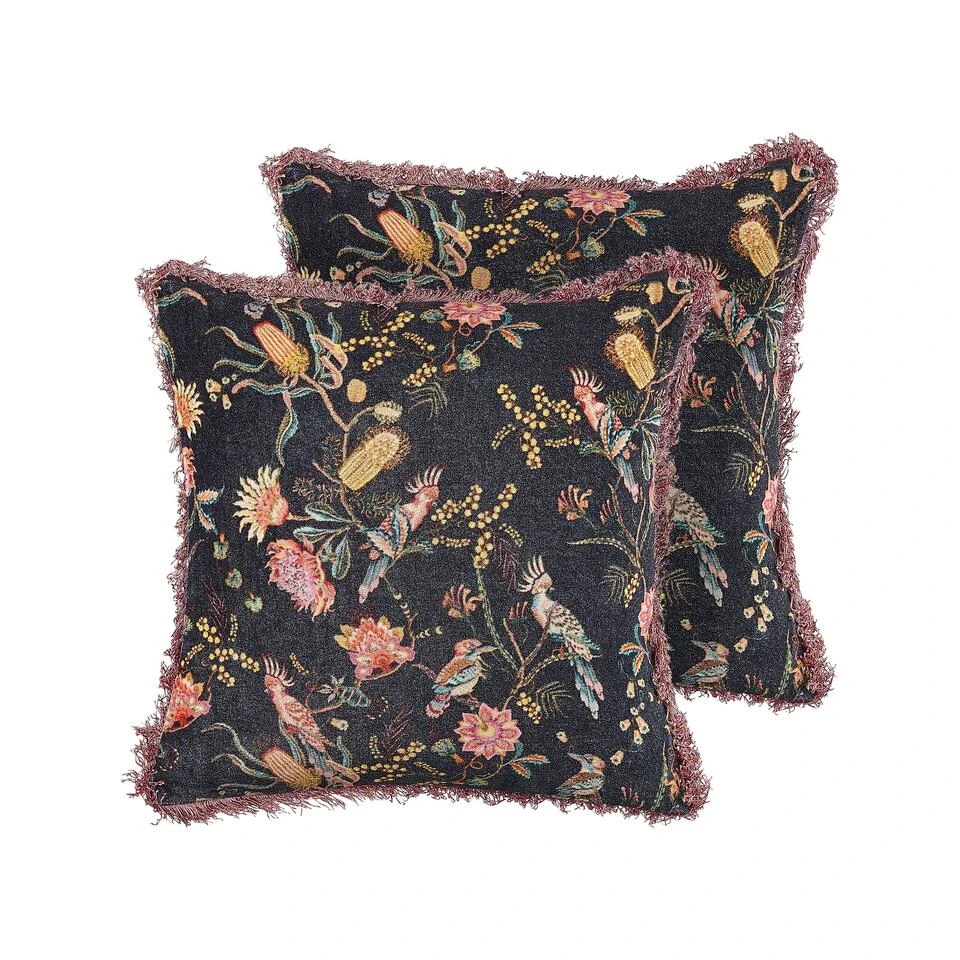 Set van 2 kussens met bloemenpatroon . Verfraai de look van je interieur met decoratieve kussens die perfect passen bij verschillende ontwerpen. Deze accessoires hebben een botanisch geïnspireerd motief op een zwarte achtergrond, dat mooi contrasteert met de roze randen met franjes. De afneembare hoezen zijn gemaakt van katoen en de voorkant heeft een fluwelen textuur.