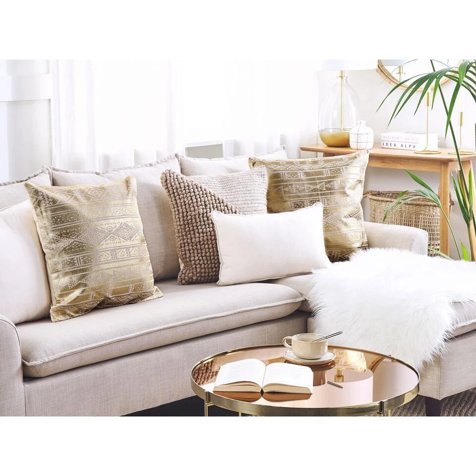 Kussen met metallic print. Voeg glamour toe aan je interieur met deze prachtige sierkussenset. Met een geometrische metallic folieprint aan één kant, zal het een extraatje geven aan een effen bank of bed. De afneembare hoes is gemaakt van katoen en zorgt voor jarenlang zacht gevoel en kwaliteit. De kussens zijn voorzien van een dik inzetstuk voor ultiem comfort.