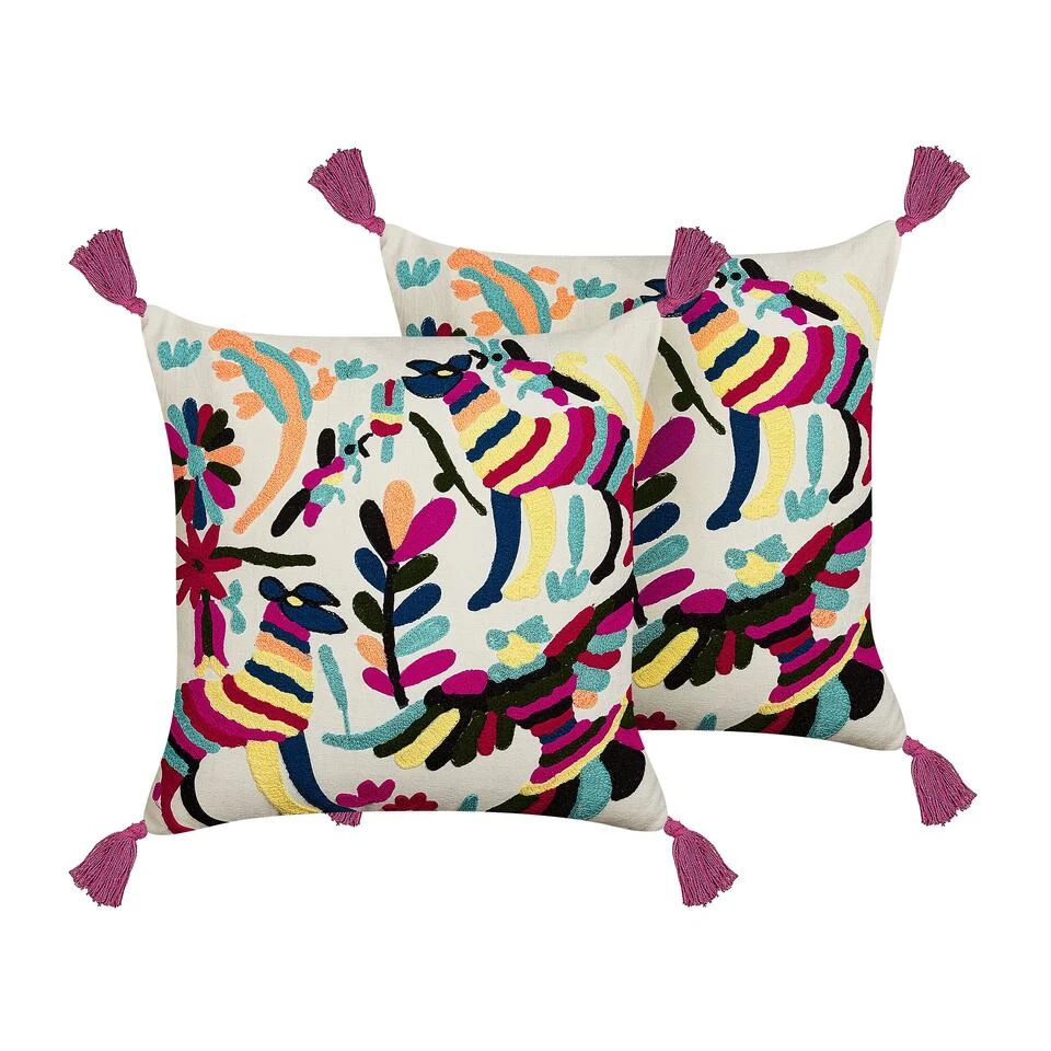 Handgemaakte Sierkussens met Geborduurd Patroon en Kwastdetail. Breng een speelse sfeer naar je woonkamer of kinderkamer met deze kleurrijke kussen set. De katoenen kussenslopen hebben een geborduurd dierenmotief en kwastdetail. Dankzij de handige ritssluitingen kun je makkelijk de kussenslopen afnemen en wassen. Door de zachte vulling van de kussens zijn perfect om een dutje op te doen.