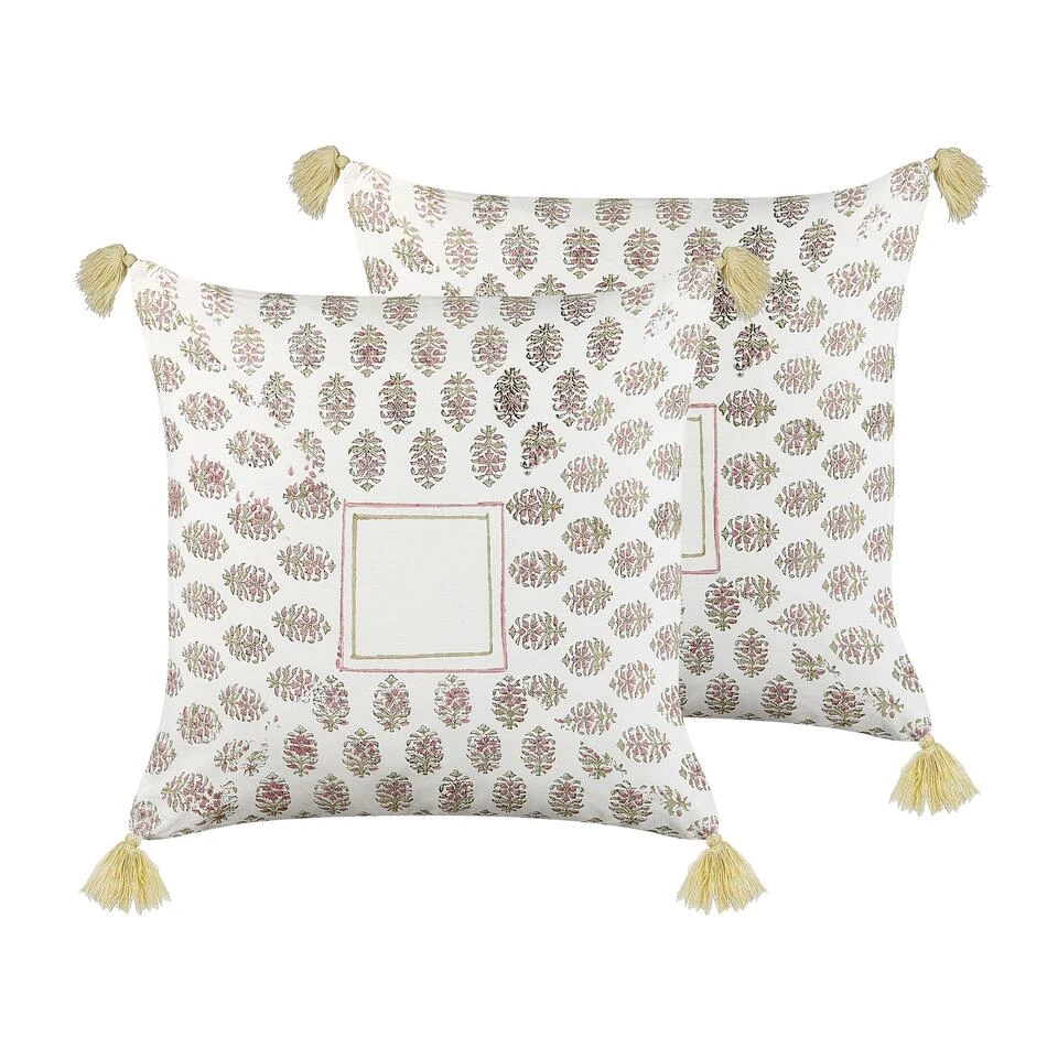 Handgemaakte decoratieve sierkussens met kwastjes. Maak de inrichting van je woonkamer compleet met deze decoratieve kussenset in een romantische stijl. Elke katoenen hoes met een geometrisch patroon is met de hand gemaakt met behulp van een blokdruktechniek en is voorzien van een ritssluiting. De hoogwaardige polyester vulling maakt het kussen ongelooflijk zacht.