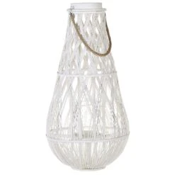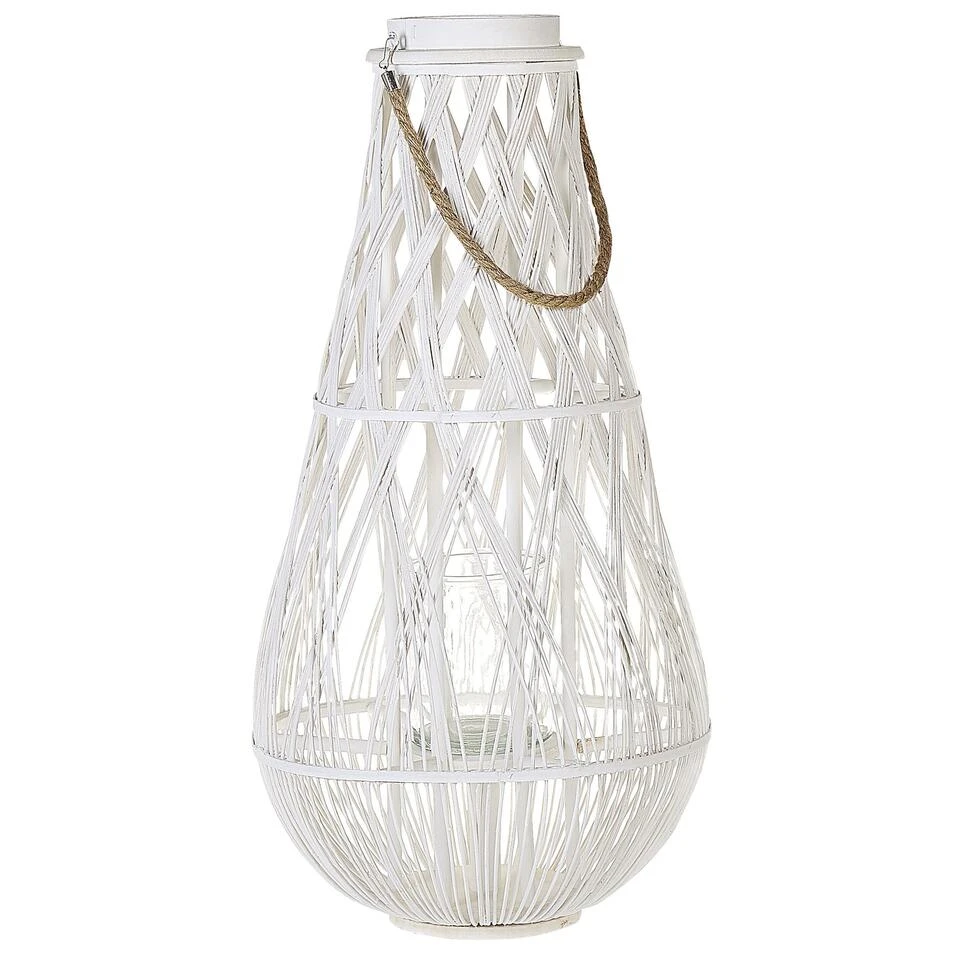 Hoge lantaarn van bamboe hout. Een lantaarn van gevlochten bamboehout zal een geweldige decoratie zijn voor een woonkamer of slaapkamer, hij zal ook op het terras werken. De handige, afneembare handgreep maakt hem gemakkelijk te dragen en de ronde basis zorgt voor stabiliteit. Binnenin de lantaarn zit een praktische glazen kandelaar.