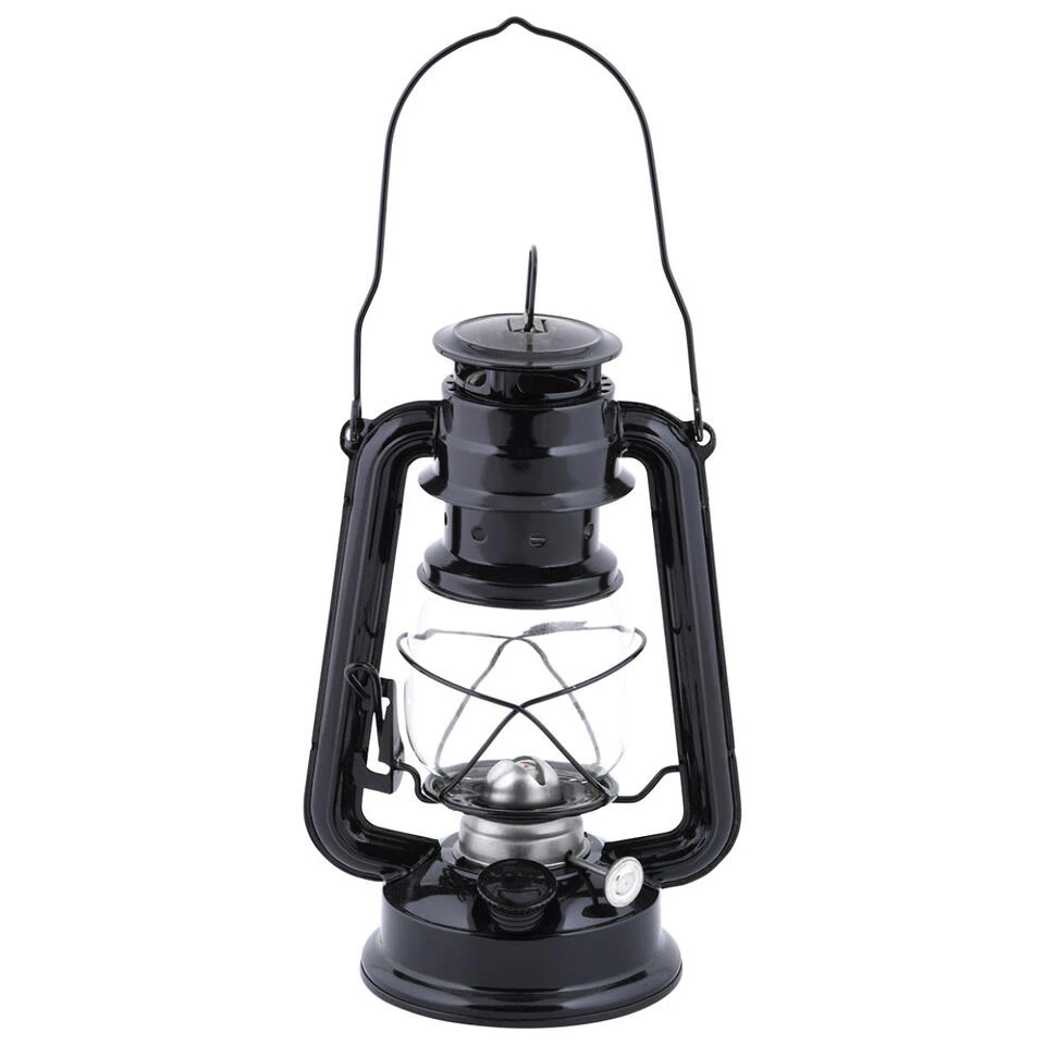 Olielamp lantaarn zwart geschikt voor lampenolie. Sfeervolle lantaarn met ouderwetse olielamp uitstraling welke te vullen is met lampen olie. Aan de bovenzijde zit een hang oog van circa 3 cm om de lantaarn makkelijk op te hangen. Formaat: 11,7 x 15,7 x 24,1 cm. Materiaal: metaal, glas.