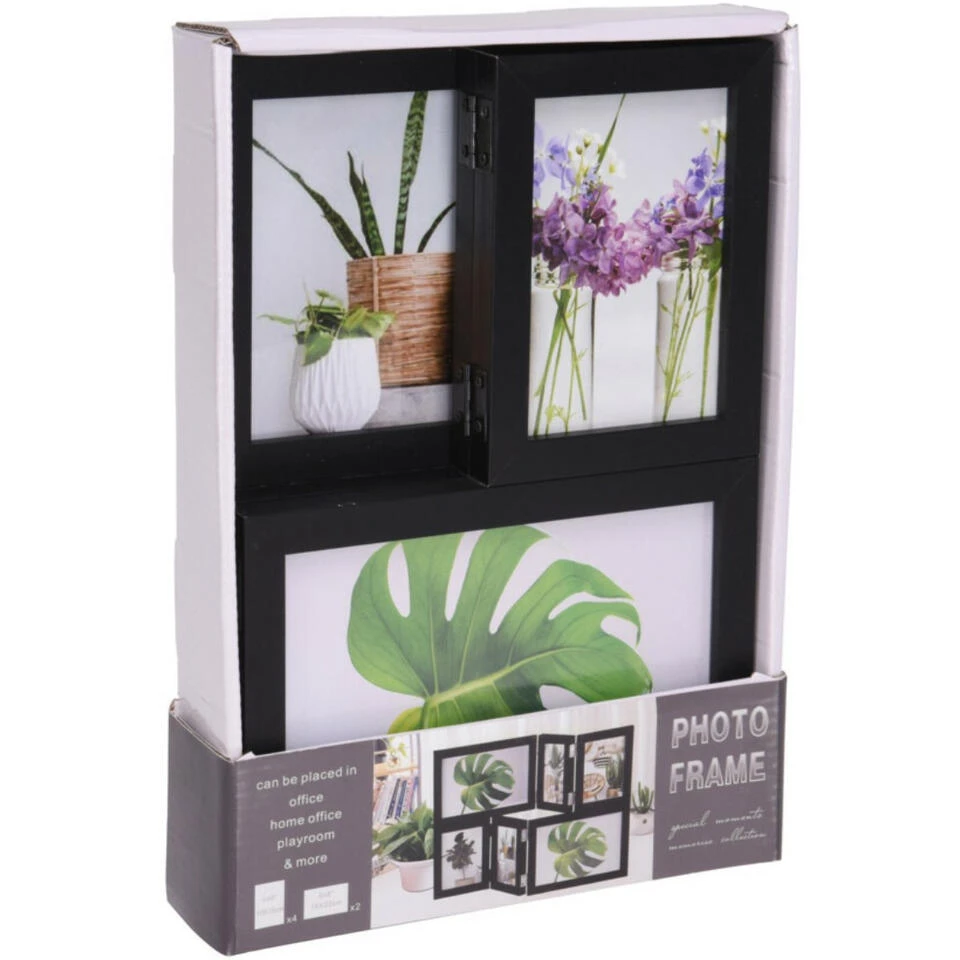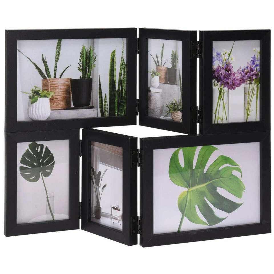 H&S Collection Fotolijstje, uitklapbaar. Dit unieke uitklapbare fotolijst is geschikt voor 6 foto’s en is een leuke toevoeging aan uw woonkamer. Hierin kun je leuke herinneringen in foto vorm bewaren naar keuze. Ideaal om op een creatieve manier foto’s te plaatsen in je woonkamer. In dit fotolijstje passen 4 foto’s van 9 x 13 cm en 2 foto’s van 13 x 18 cm. Materiaal: kunststof. Kleur: zwart.