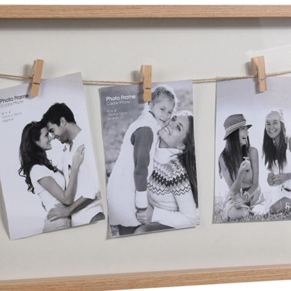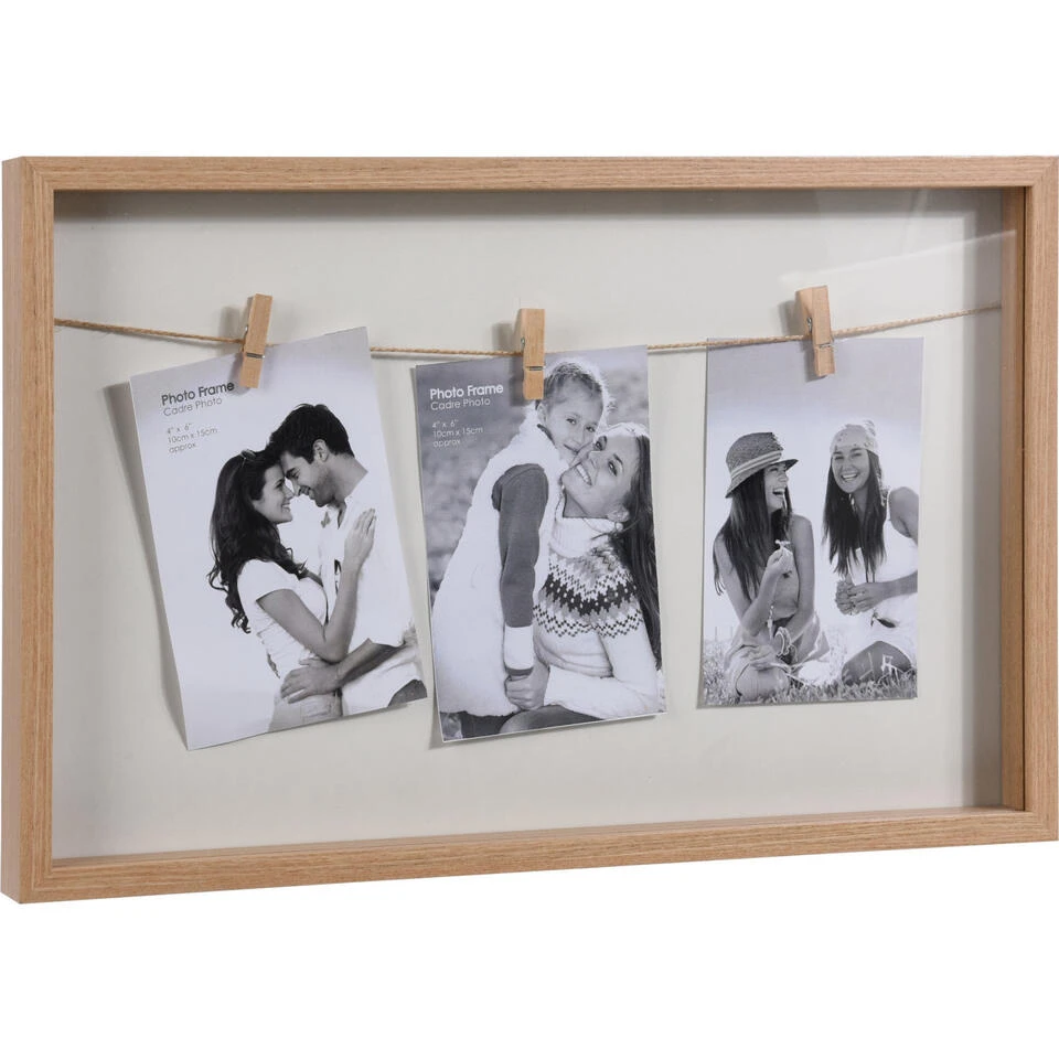 Houten fotolijst bruin/wit met 3 knijpers geschikt voor een foto van 10 x 15 cm. De fotolijst bestaat uit een vak met daarin 3 knijpers om je foto’s of andere dierbare herinneringen op te hangen. De fotolijst is eenvoudig op te hangen doormiddel van de bevestigde haken aan de achterzijde. Afmeting lijst: ca. 41 x 27 x 3 cm. Materiaal: hout.