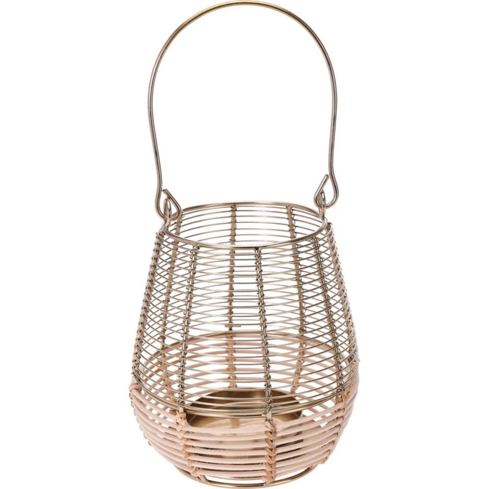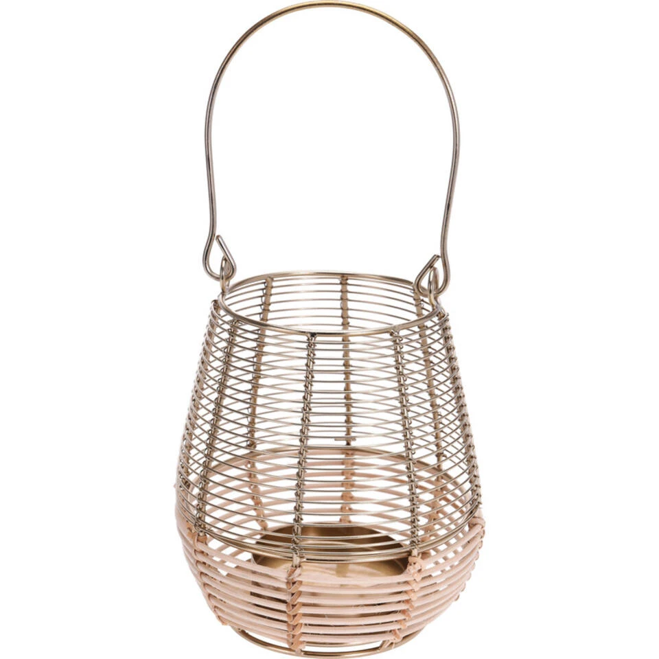 Metalen/rieten lantaarn kaarsenhouder goud 14 x 18 cm. Lantaarn van goudkleurig metaal met gespannen/geknoopt riet rondom. Er past een kaars van maximaal 6 cm doorsnede in de houder.