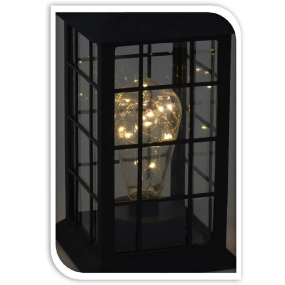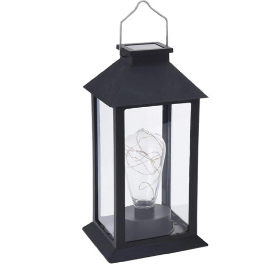 Zwarte, rechthoekige led solar lantaarn 27 cm. Zwarte tuindecoratie lantaarn werkend op zonne-energie. Het formaat van deze tuinlantaarn is ca. 14 x 14 x 27 cm. Materiaal: kunststof. De brandduur hangt af van de weersomstandigheden, 8 uur volle zon zorgt voor een maximaal aantal branduren.