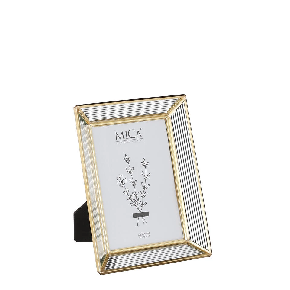 Fotolijst Stielo uit de collectie van Mica Decorations heeft door het gebruik van goud metaal een chique look. Uniek is de bijzondere omlijsting van geribbeld glas. Je foto zal in deze glazen fotolijst extra mooi uitkomen! De fotolijst past in elk interieur en ziet er prachtig uit op een nachtkastje, bureau, tafel of in een kast. De afmetingen zijn L20 x B2 x H16 cm. In het lijstje past een foto van 10 bij 15 cm.