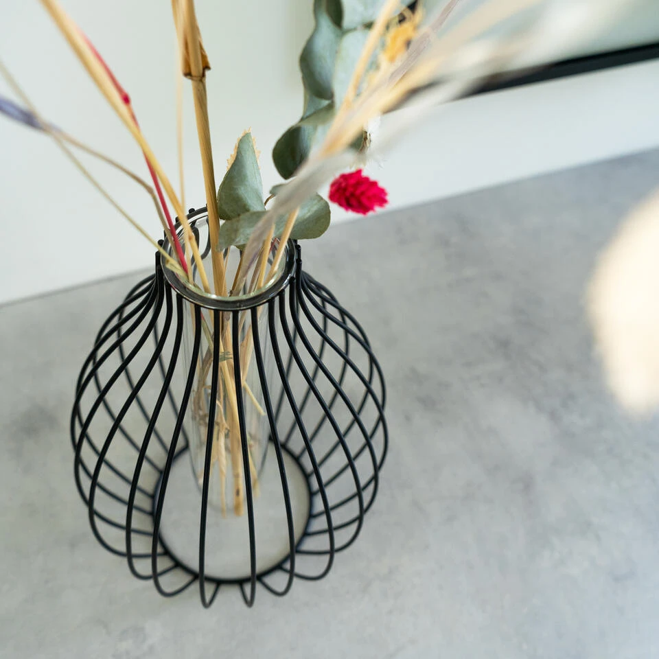 Deze bloemenvaas past goed bij een moderne stijl. De metalen spijlen van de bloemenvaas zijn geometrisch en passen goed bij een modern interieur. Ook is deze vaas goed te combineren in andere woonstijlen. Deze minimalistische stijl is op het moment erg hip.