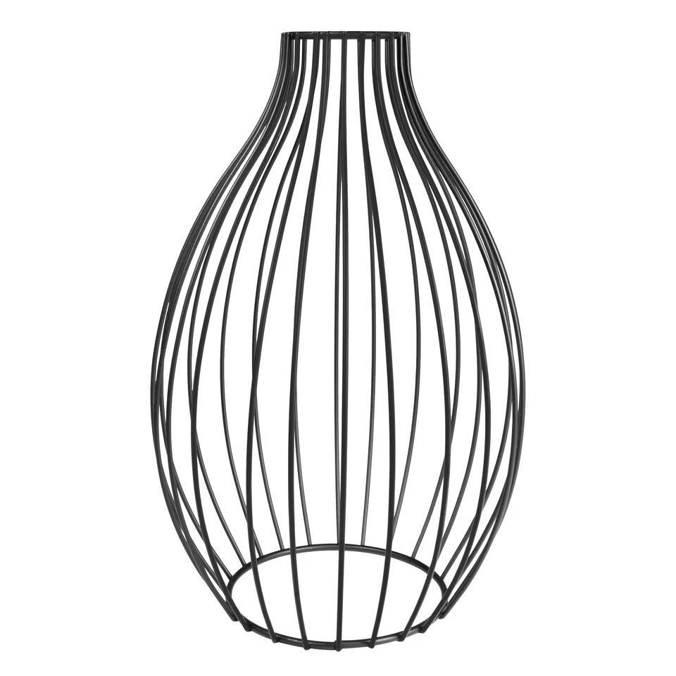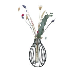 Tussen de metalen spijlen hangt een langwerpige glazen vaas. Dit kleine vaasje vul je met water en er is ruimte voor een paar bloemen of een bosje wilde bloemen uit de tuin. Het glazen vaasje is dus een stuk kleiner dan het metalen gedeelte.
