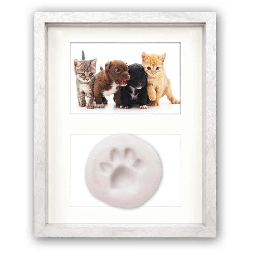 Houten fotolijstje met pootafdruk kit geschikt voor een foto van 10 x 15 cm. Bij de fotolijst wordt een pootafdruk kit geleverd waarmee u een pootafdruk van uw huisdier kan maken en in de lijst kan stoppen. De pootafdruk kit bestaat uit klei en rolletje. Het lijstje is te gebruiken voor: 1x: foto van 10 x 15 cm en 1x: pootafdruk of 2x: foto van 10 x 15 cm. U kunt het fotolijstje staand en hangend presenteren, het lijstje is voorzien van een standaard en ophangoogjes. Afmeting lijstje: ca. 22 x 27 x 4 cm. Materiaal: hout, glas.